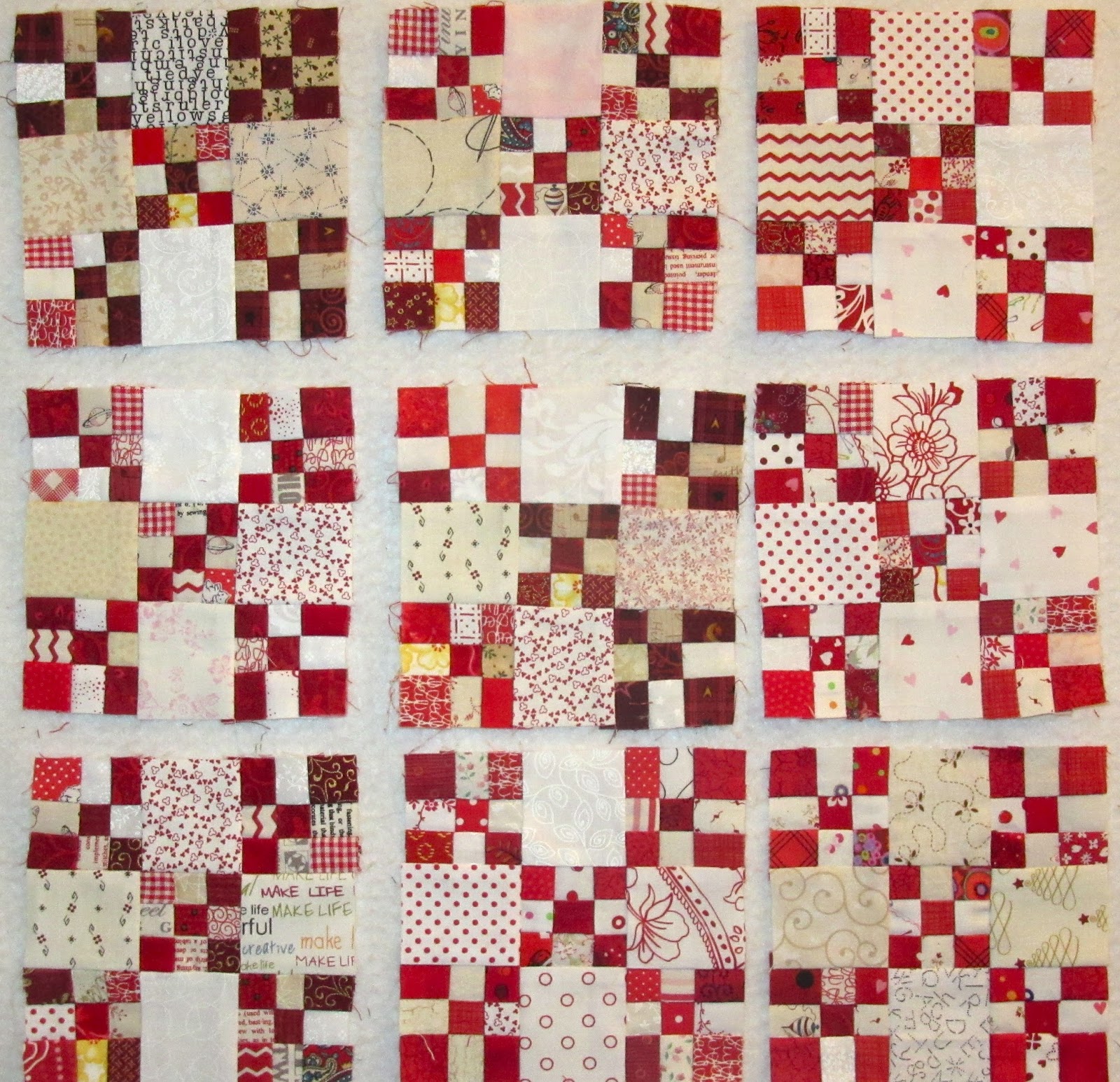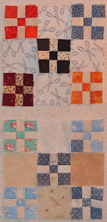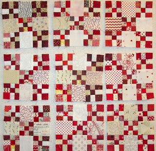 Now I am trying to decide how scrappy to make the little double 9 patch blocks. The pattern calls for completely unorganized scrappy style, which I might do a bit of, but mostly I think I will want to co-ordinate the blocks a bit more because I like doing that.