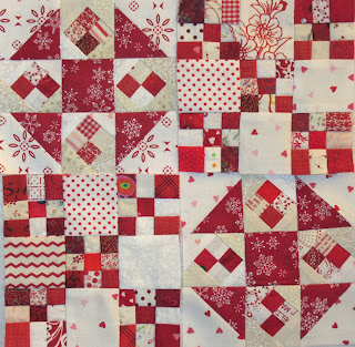 You can see some of the projects I've been working on this year here. This is a photo of 56 of my double 9 patch Omigosh blocks on the design wall. More blocks have been made since then, and today I'll be adding to the red pile.