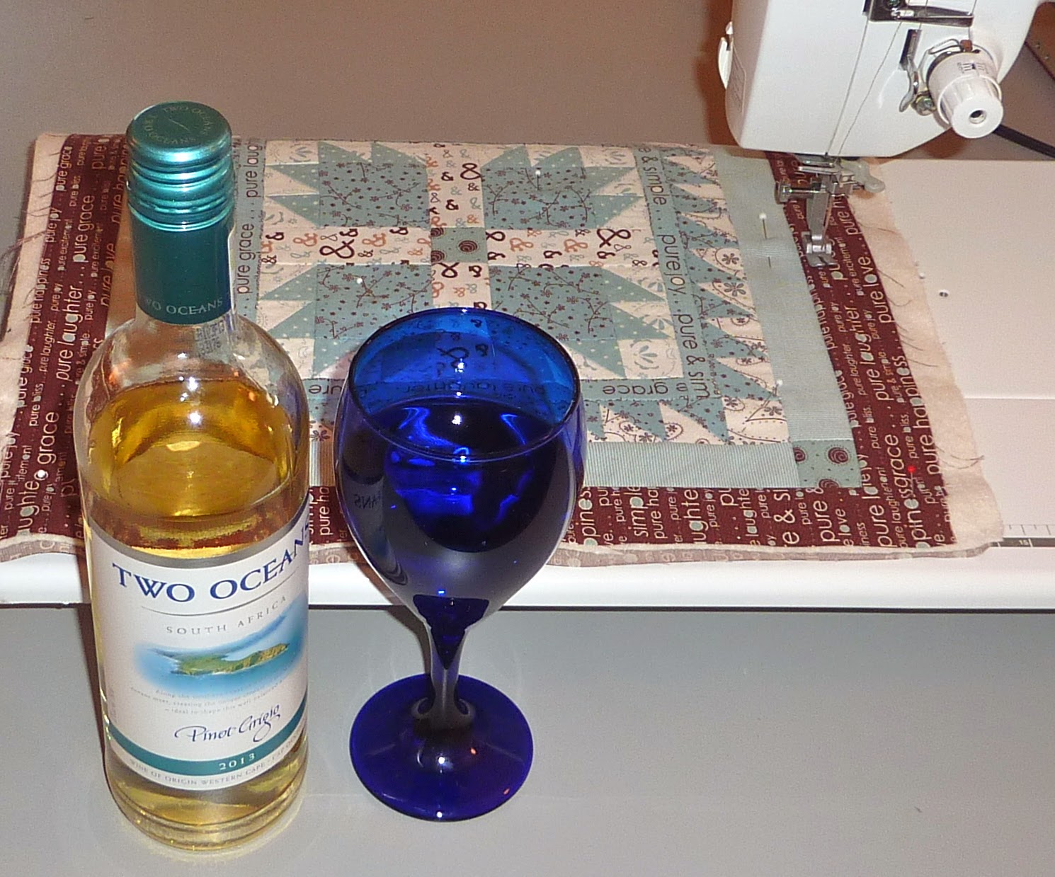 Wine was bought to match the Rainbow Scrap Challenge colour of aqua, and I worked on machine quilting blocks for my UFO this month.