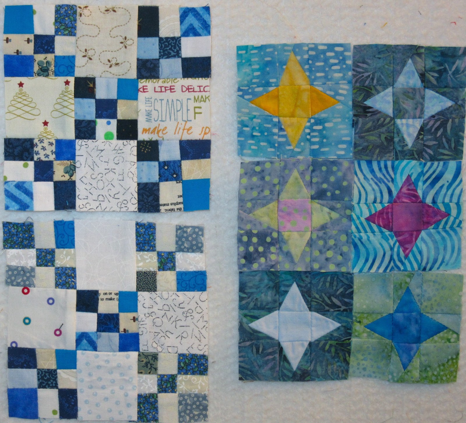 Here are two more double 9 patch blocks for Omigosh, and 6 more Alamo Stars. These are l-o-n-g term projects.