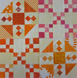 I enjoyed sewing up her scraps mixed in with my own orange squares, and sewed 6 double nine patch blocks.