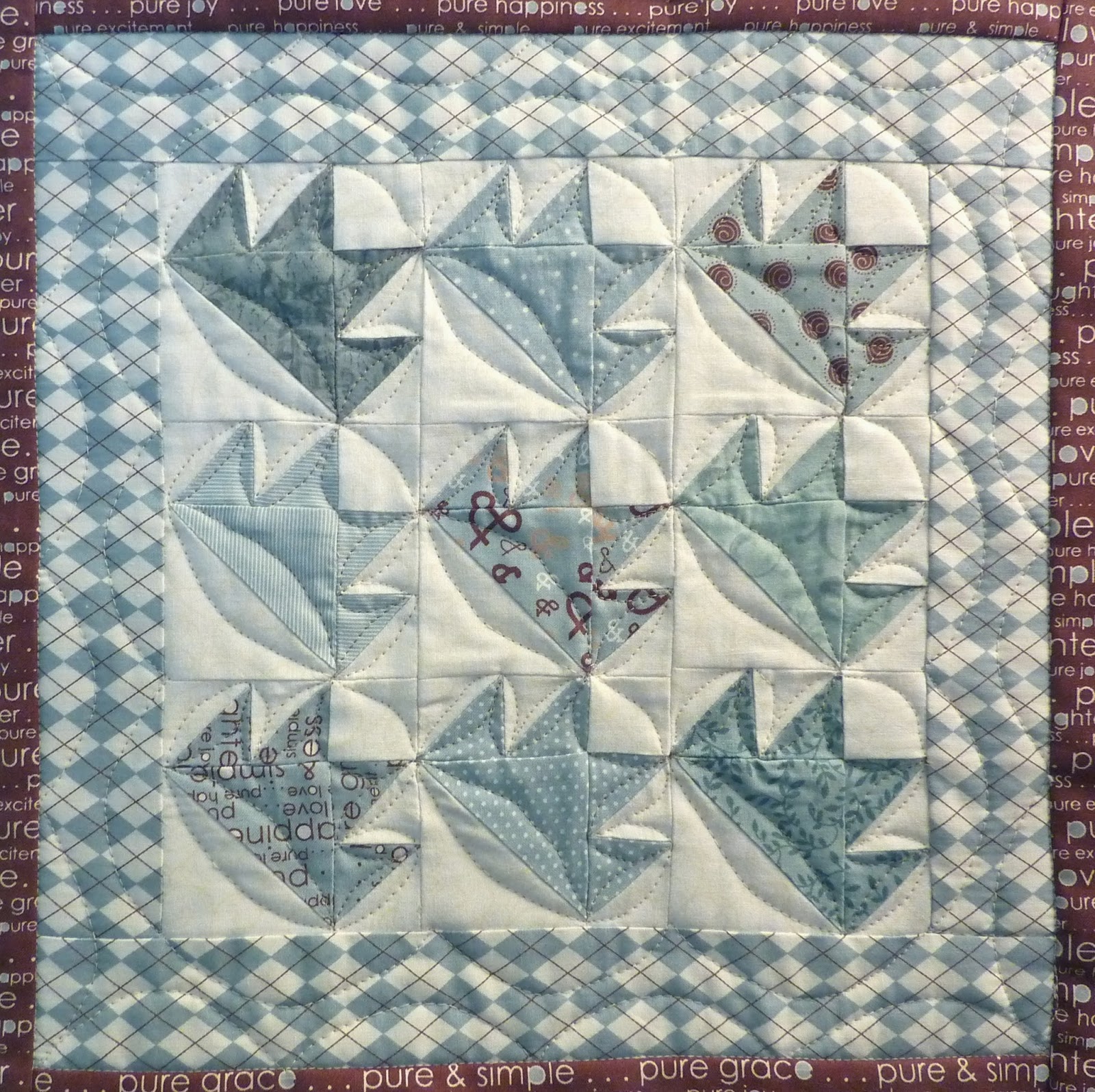 I think this is one of my favorite blocks so far. I think the quilting makes the blocks look like tilted crowns. It is fun to quilt each block differently using the same shapes.