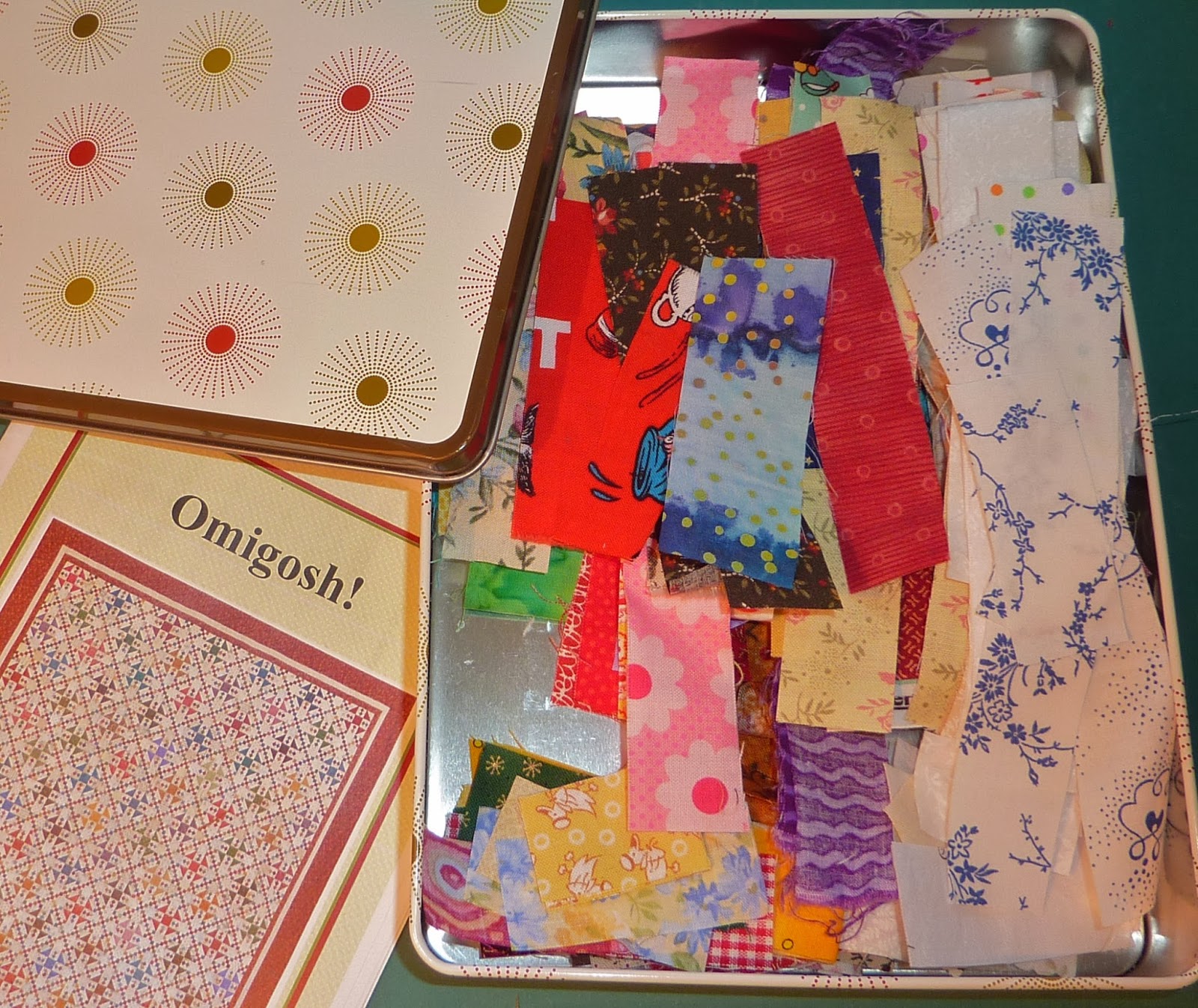 I save pretty tins when I come across them, and this is the one that has been chosen to hold the 1" scraps for my Omigosh project. The tin is exactly the same size as the pattern, so everything can be kept together for when I feel like working on it.