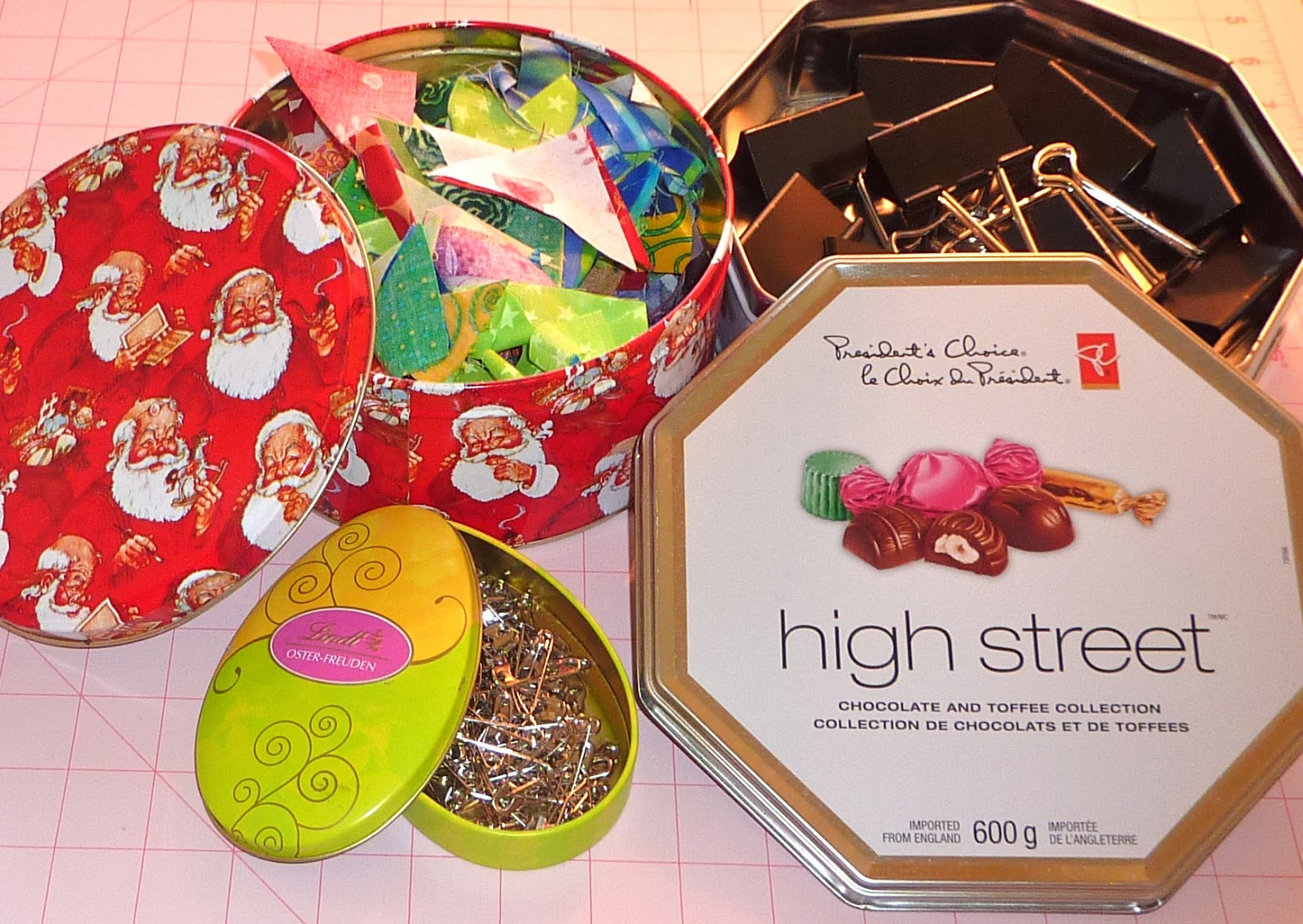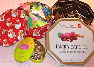 These are some of the tins I can see around me right now... a Christmas cookie tin to save little triangles, a chocolate tin to keep all my large clips together, and an Easter Lindt tin to keep large basting pins at the ready.