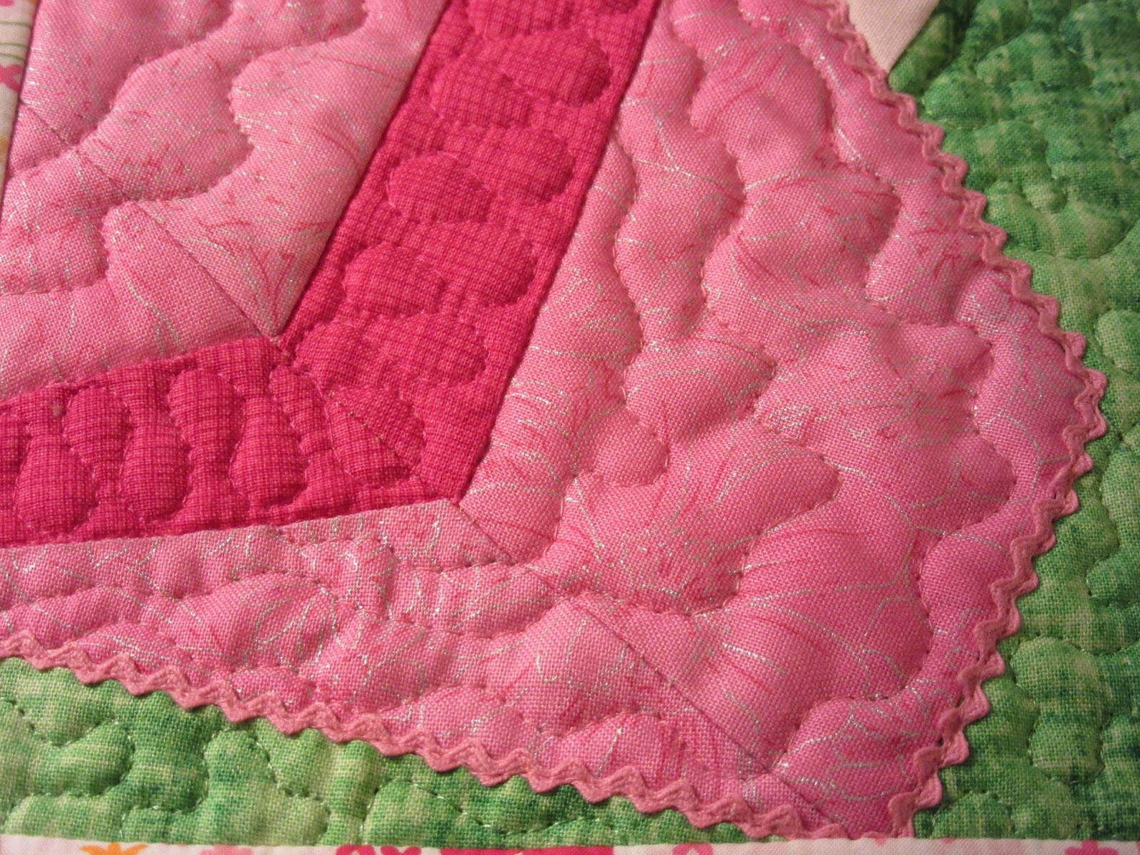 I machine quilted stippling in the grass, waves in the dress and a ribbon design on the ribbon. I also added a tiny pink rickrack around the bottom of the dress.