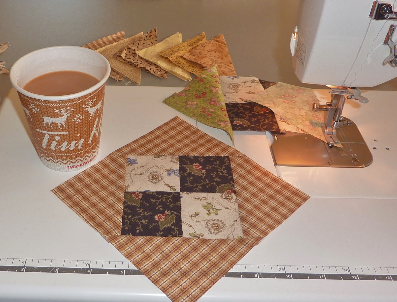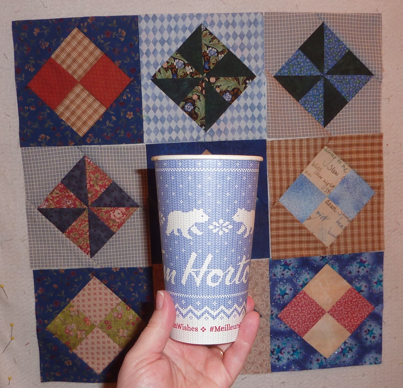 I have been making some blocks for my guild's monthly quilt pattern project. Doesn't this block look yummy beside the Tim Horton's small takeout cup of coffee? I love the seasonal cups that Tim's have this year with the knitted patterns on them!