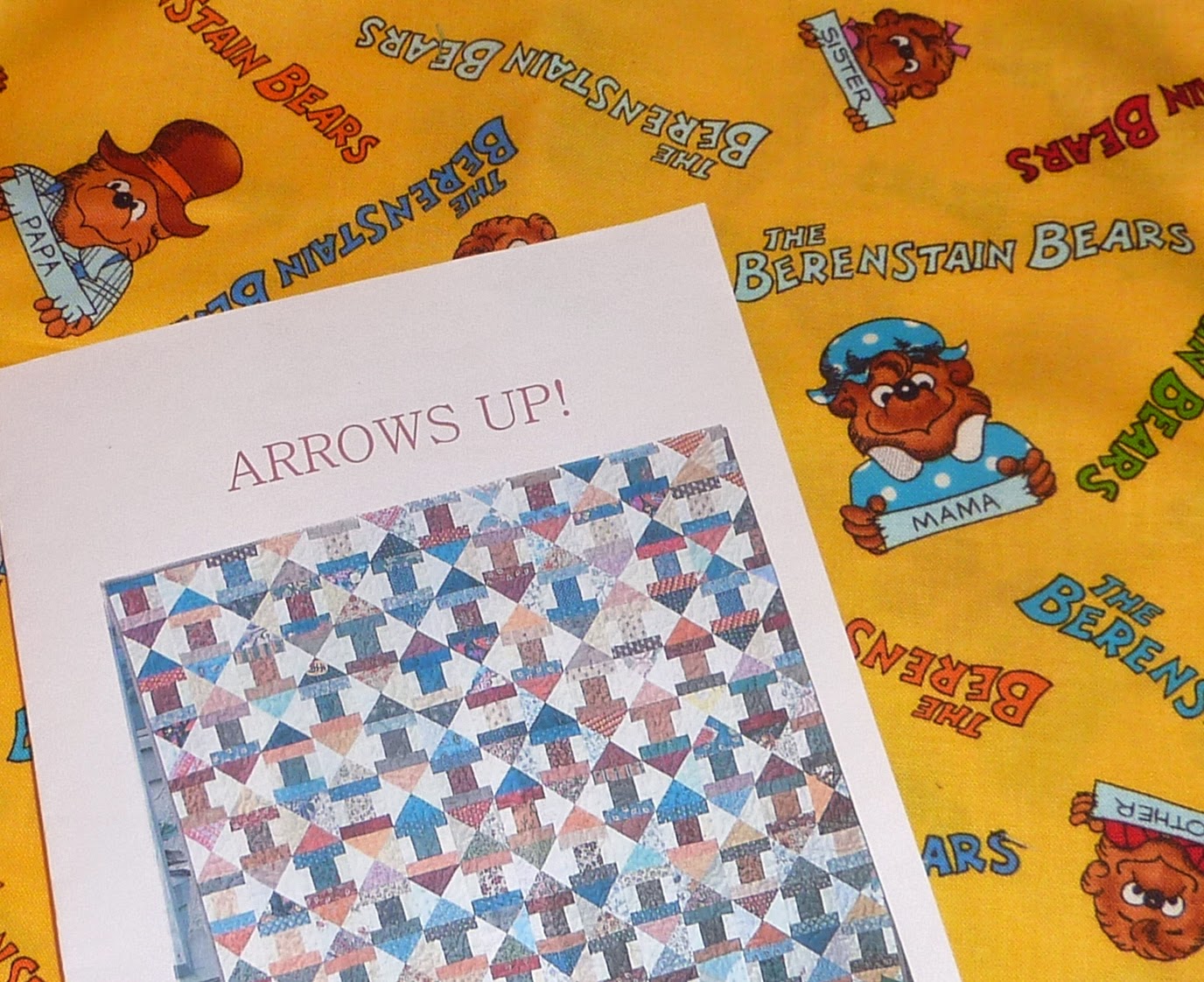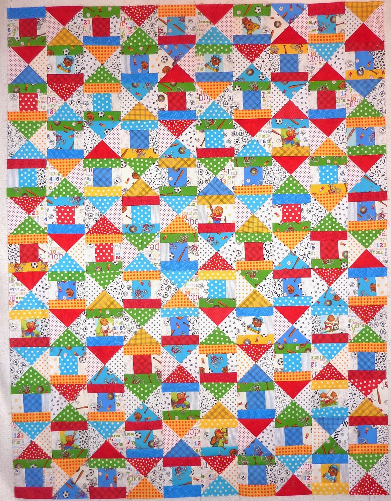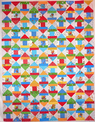 Here are the blocks sewn together for the QPOM (Quilt Pattern of the Month) at my quilt guild. This is called "Arrow's Up" and the pattern is by Jackie Syer at FRJ Designs. I used primarily Berenstain Bears fabrics and scrappy lights. It looks like a bit of a hot mess, since I sewed the blocks together randomly. I'm thinking of adding a border or two to make it a bit larger.