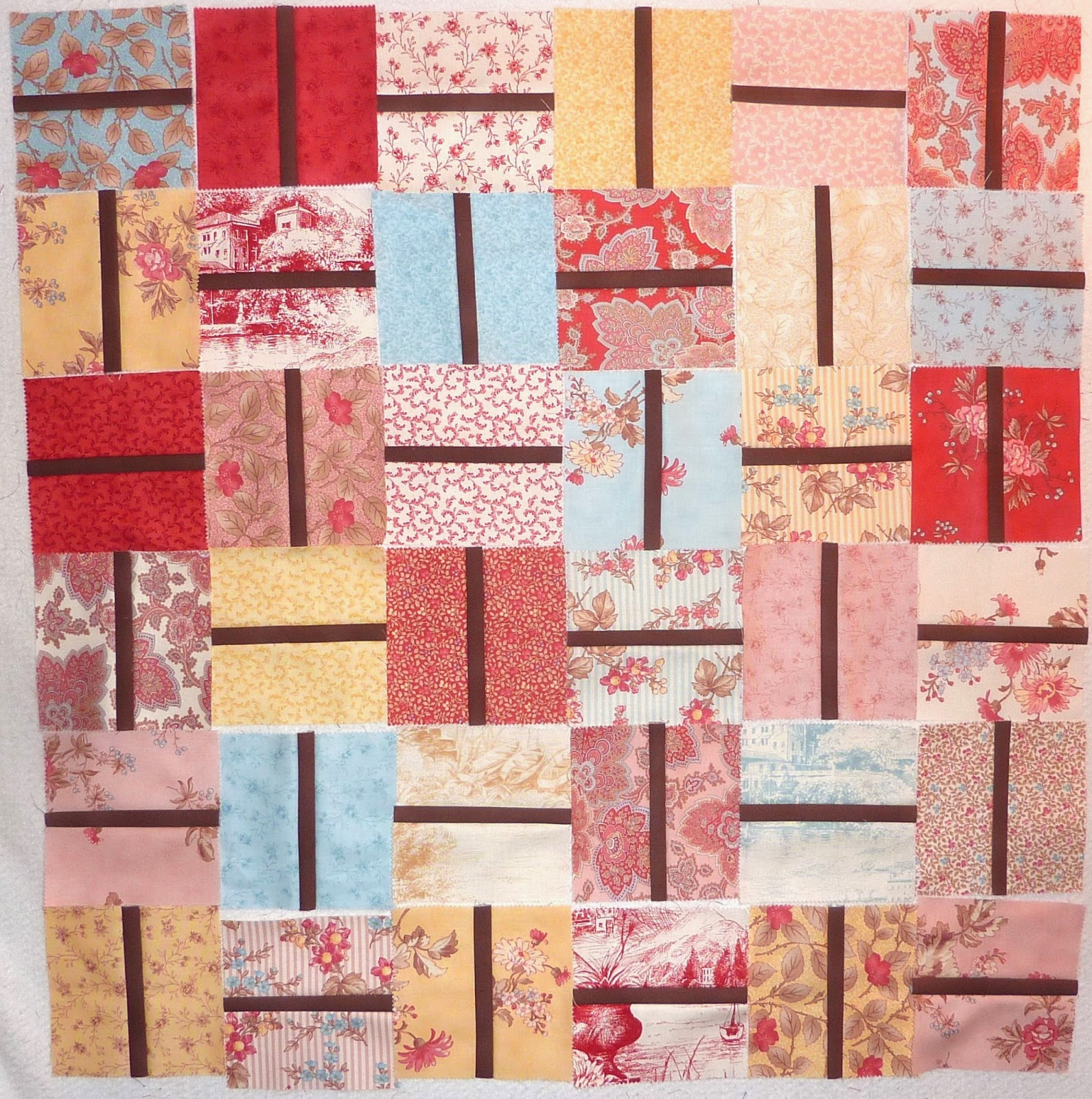 Most of the squares are ready with the brown centers sewn in, but I need to find a few more fabrics to fill in the missing blocks. I used two charm packs but am 4 blocks short for a layout of 9 by 10.