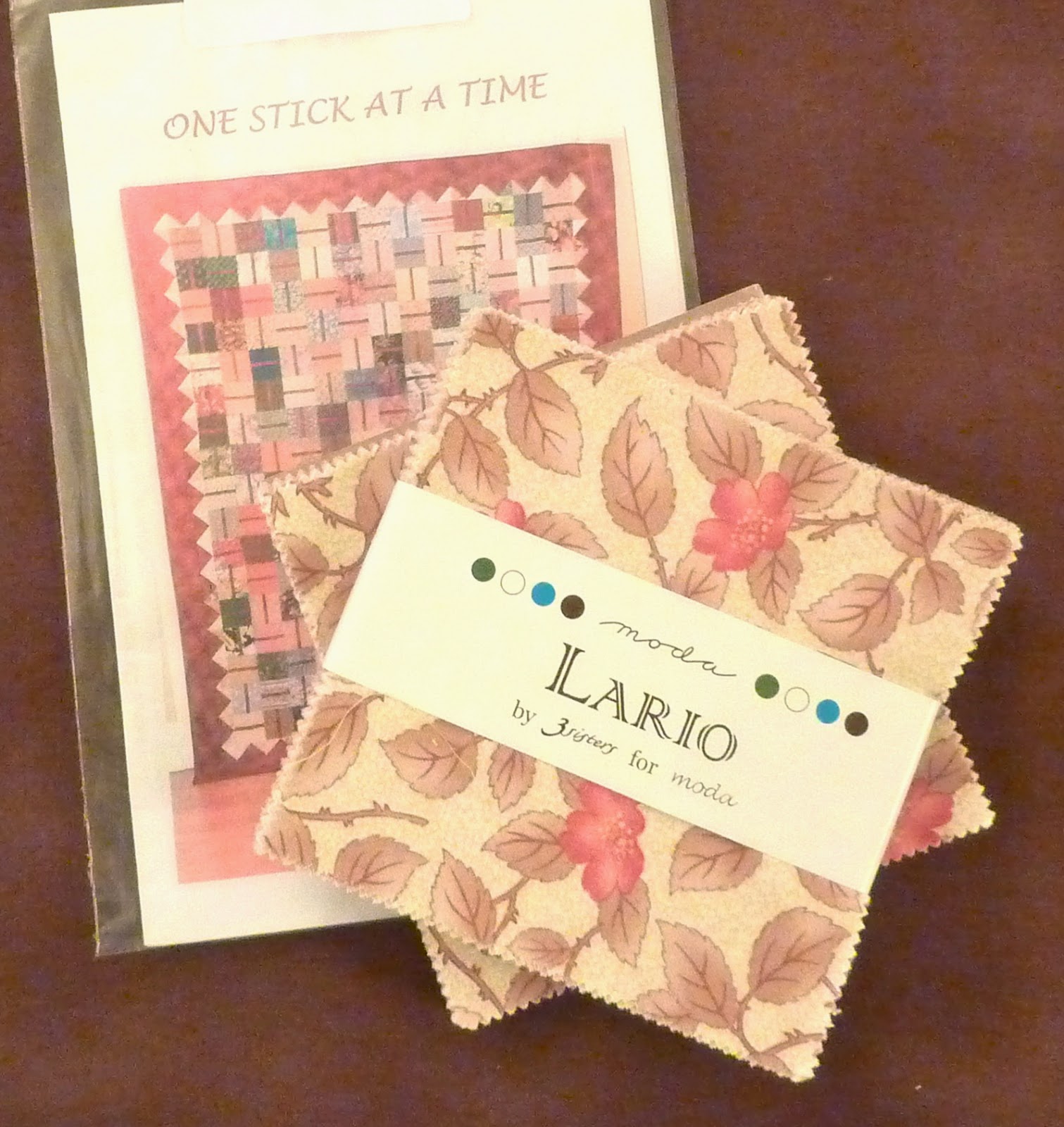 In the meantime, I'm starting a new project for my spare time. My quilt guild is hosting a QPOM (quilt pattern of the month) this year to help us use up stash, and this is our 4th project. I am using up these Lario Moda charm packs and the brown yardage will be the "sticks". It should be a quick and easy pattern to sew, which is perfect for those times when you are avoiding shopping and would much rather stay home and sew!