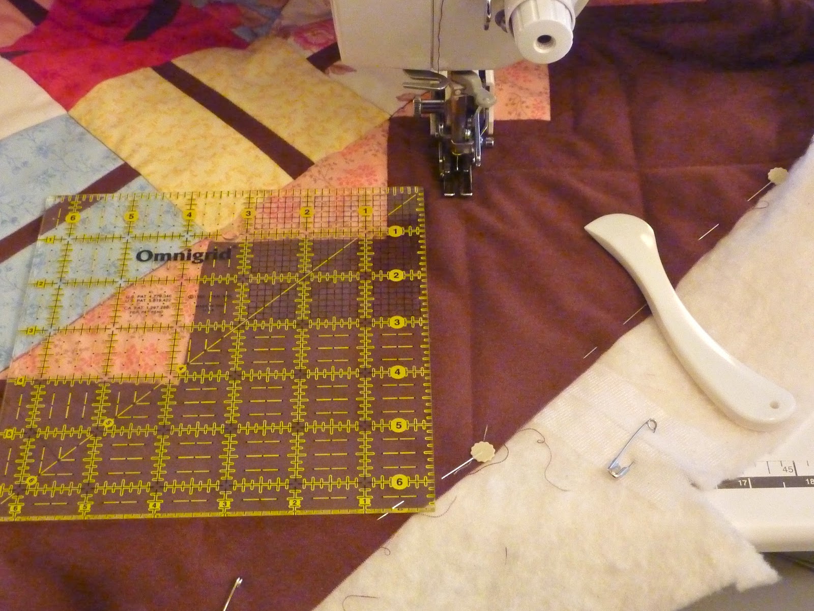 Once I finished quilting a line 1/4" beside the flying geese border, I made more straight lines in the brown border. I used my hera marker to make the guidelines. What a great tool this is! It doesn't leave any chalk or marker on the fabric, just an indentation to follow. You just need to have really good lighting when you quilt to enjoy using the hera marker. I marked the lines as I went along, and it turned out okay. Onto the binding...