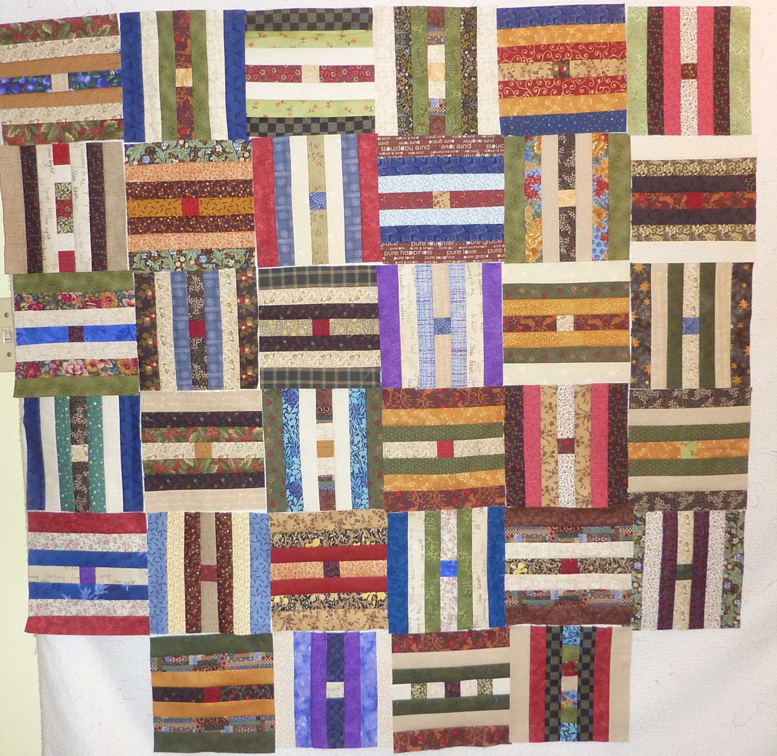 I have made progress on my QPOM scrappy rail fence blocks and here they are on the design wall today. There are 34 of the 63 blocks needed, so the blocks are more than half finished.