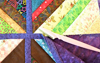 2) Trim all sections carefully - the backing, and the quilt top should all be exactly the same size. The batting will be trimmed 1/4" more by hand once the sections are joined.