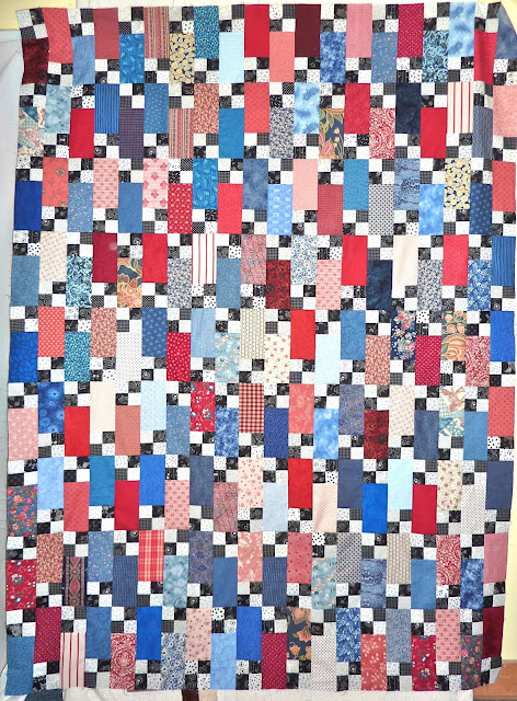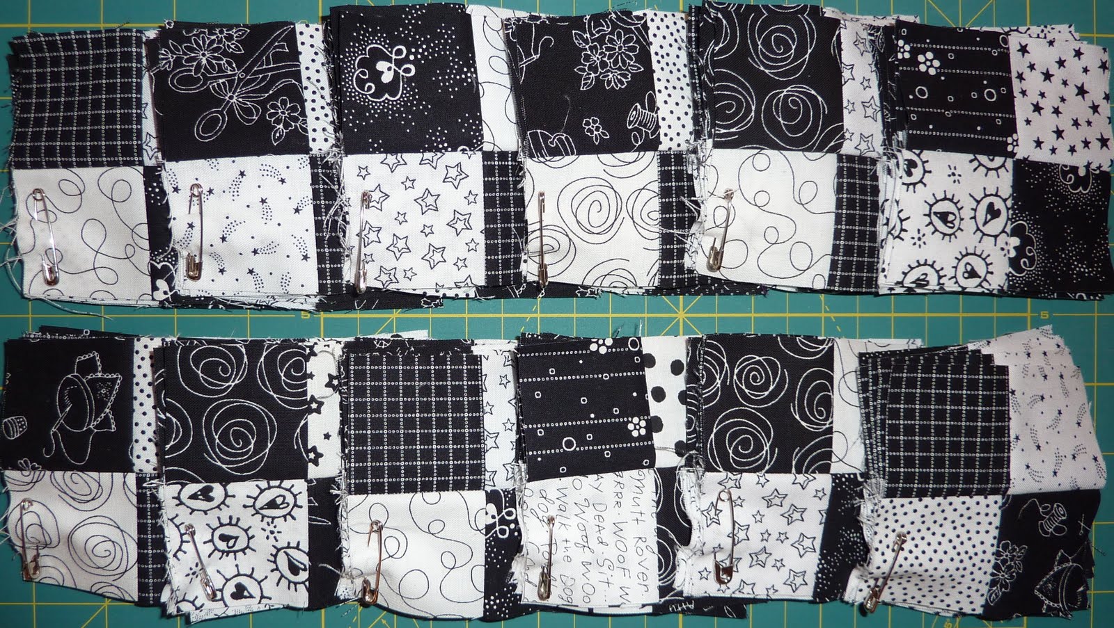 We are each searching our stashes for more red and blue fabrics for the bricks and I am sewing the black and white 4 patches using fabric from my stash. I love to collect black and whites and am happy to use up some of them in this quilt.