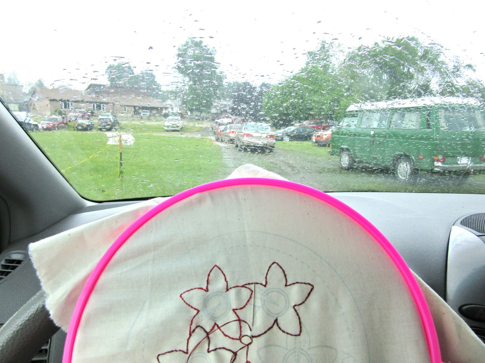 And while I waited to leave, it continued to rain, and I continued to stitch. The stitches are a little wobbly so don't biggy size the photo. The traffic was at a stand still, and look how much I got stitched on my next block! I will be putting more stitches in today.
