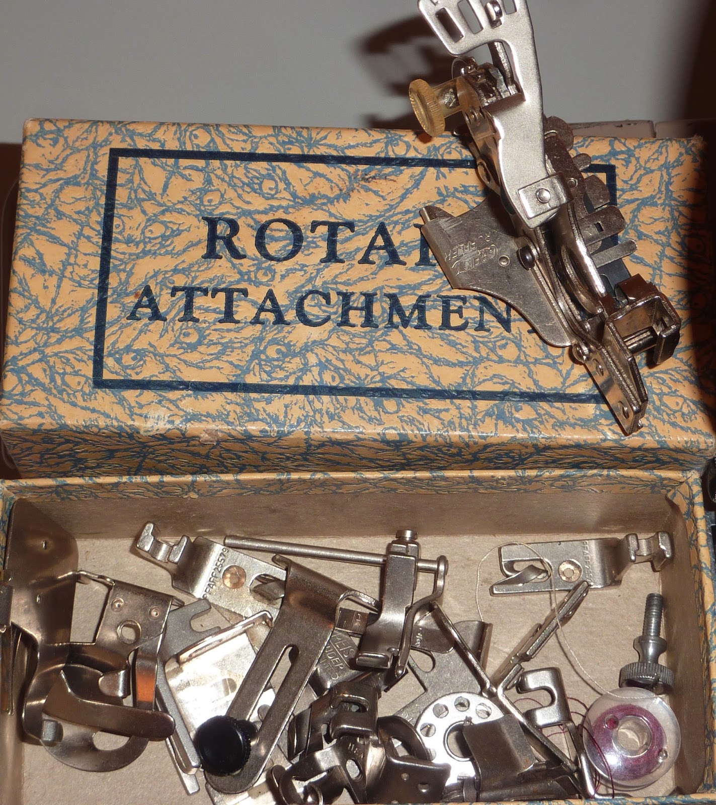 These machines also came with some attachments, but I don't know what all these things are yet. I do know that the two bobbins that were in the box are not for the 301. One is plastic (no plastic for these old gals!) and the other bobbin is too wide for the 301 bobbin case.