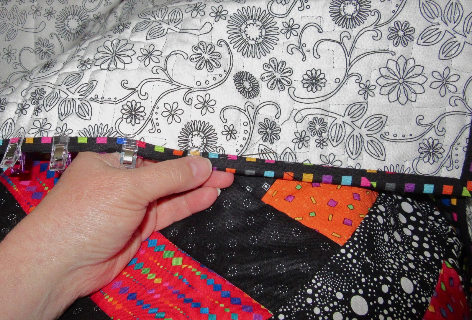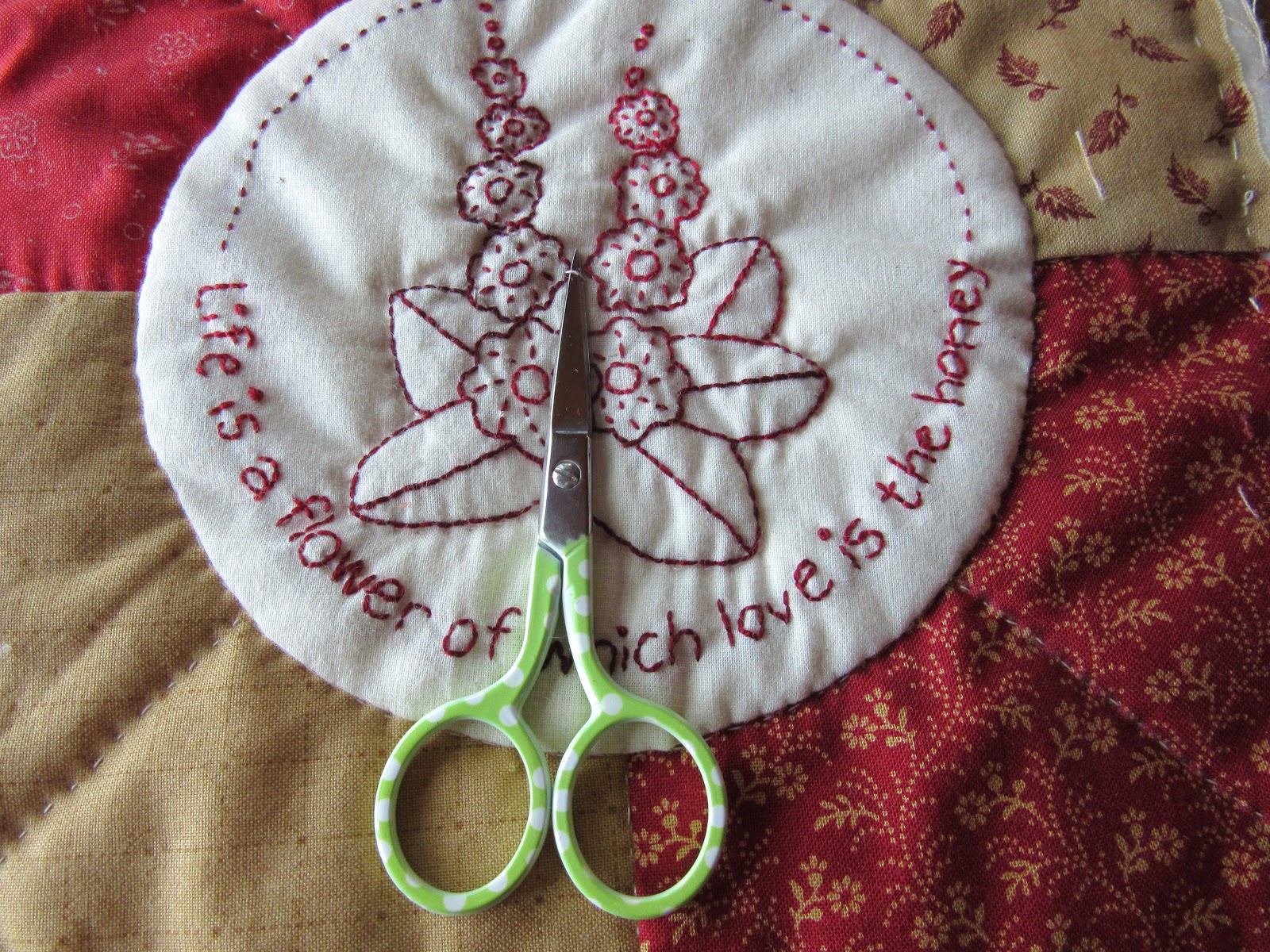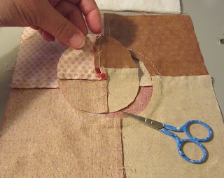 So I cut away the excess fabric behind the appliqued circle, re-basted the sandwich, and started again.