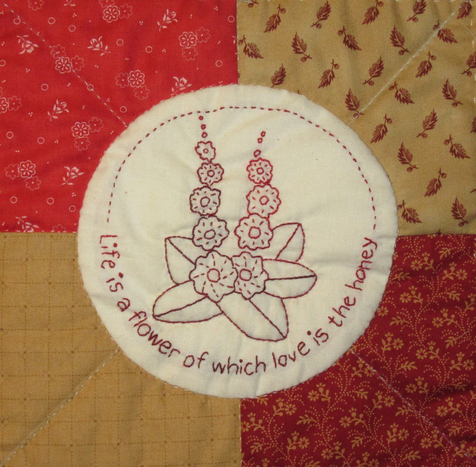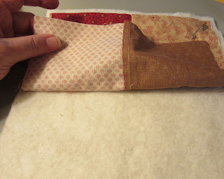 When starting to quilt my latest block, I noticed that the sandwich felt quite thick in the middle. I unpinned the block and separated the layers, and realized that I had forgotten to cut away the fabric circle behind the applique. Why didn't I notice that when I was pin basting the block??!