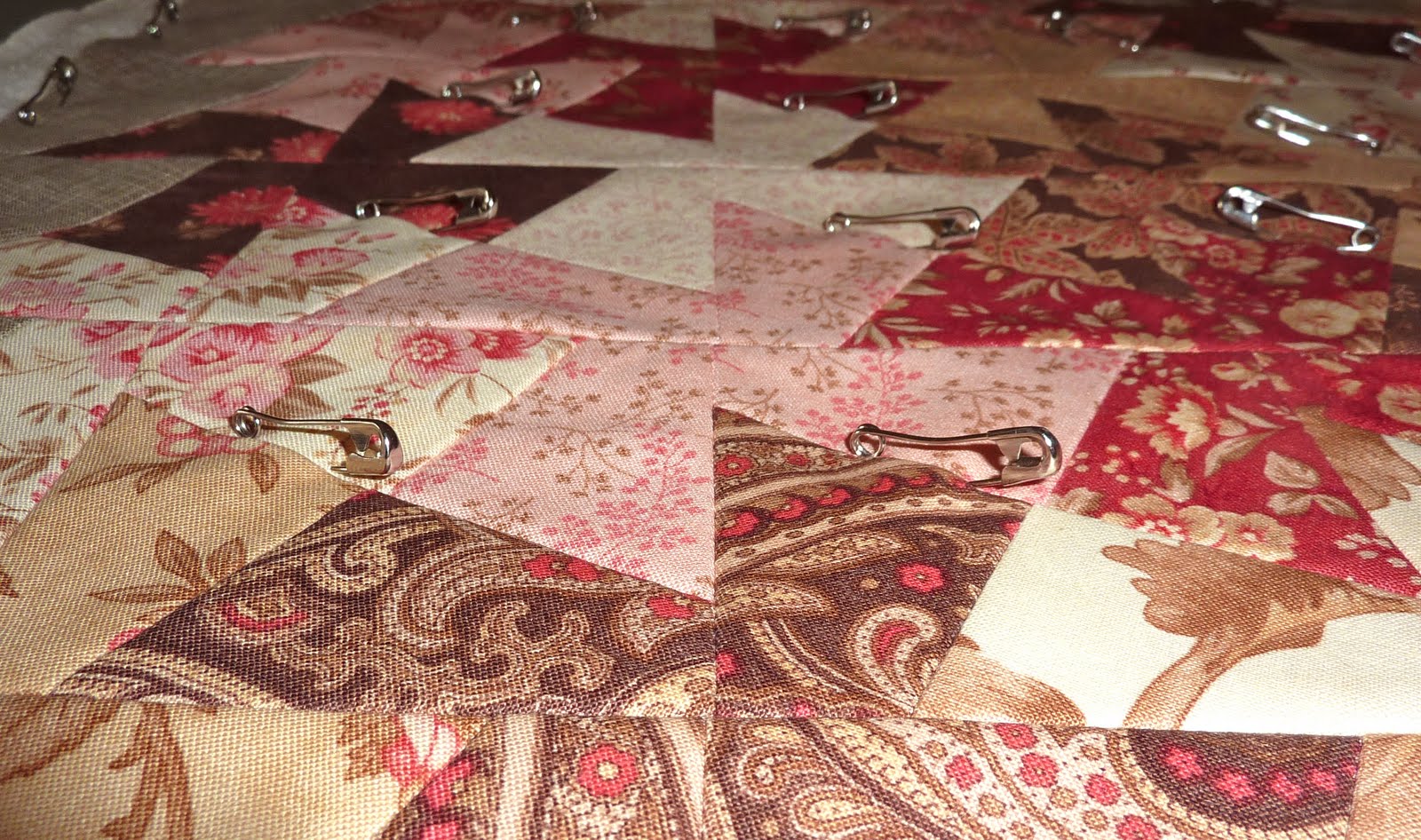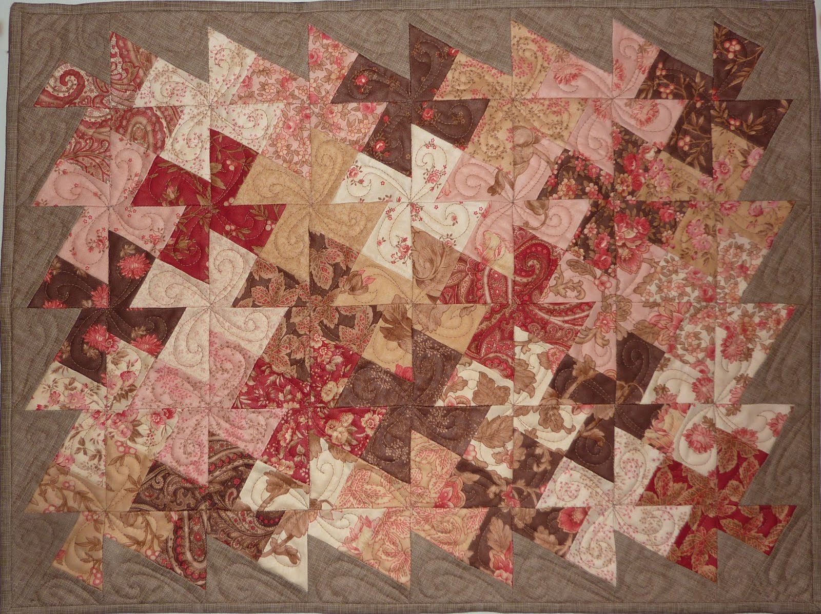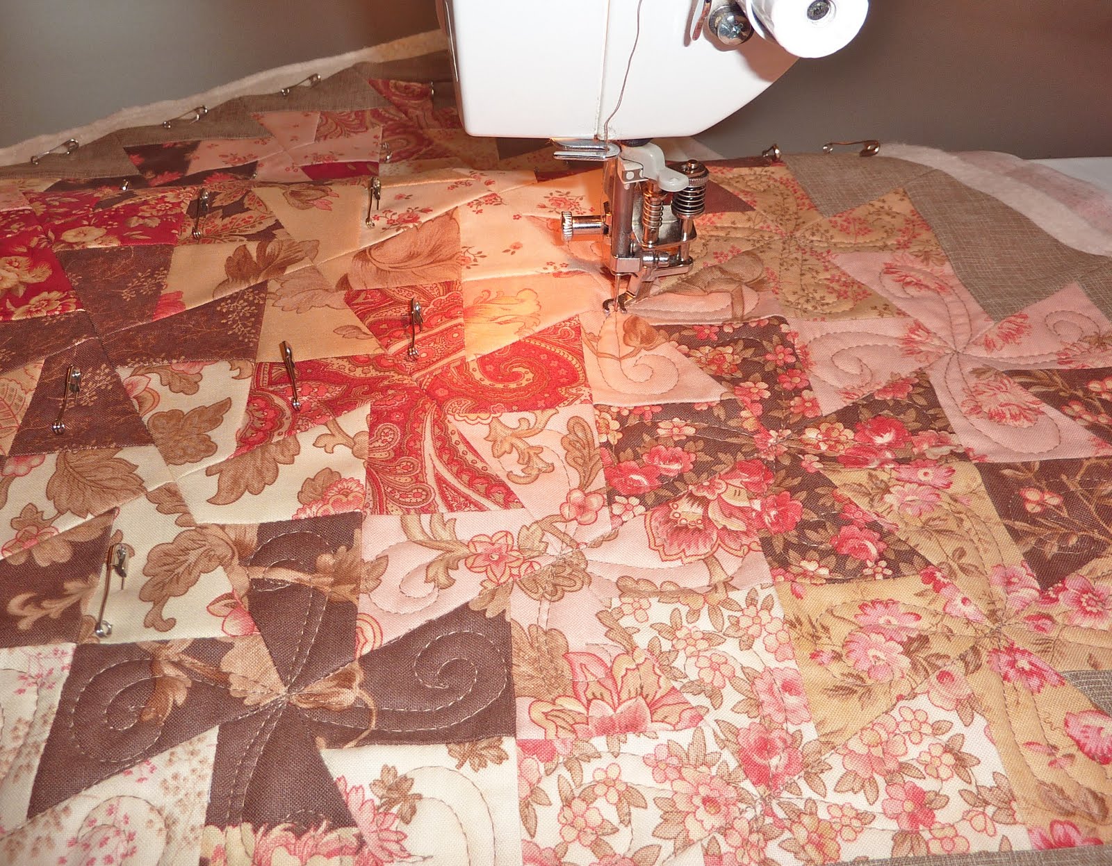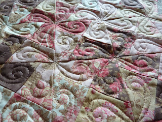 I decided to use a camel coloured thread and quilt some hooked feathers (from Sally Terry's book) in the pinwheel blocks.