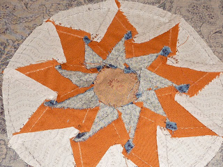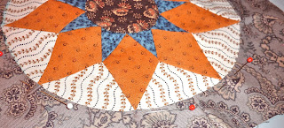 Here is a photo of the backing, which was pieced from leftover chunks of this project and from Circa 2016. I have no idea why that dark square is pieced right there in the middle like that! Must have seemed/seamed like a good idea at the time! I will attach the label near that square since it draws the eye to look there. I'm working on a photo transfer label for this quilt.