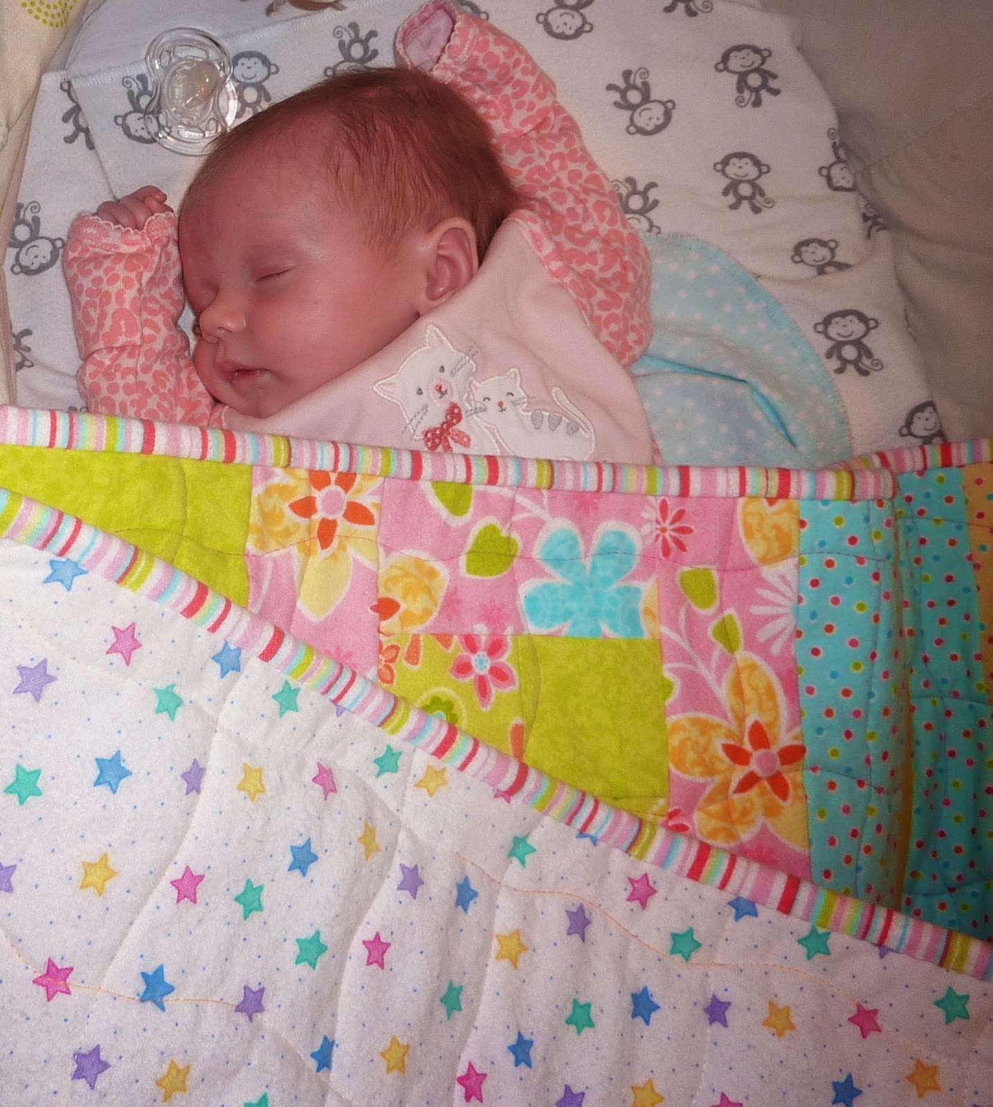 Even though I am trying to be okay with "random layout", the places where there are clumps of colour bug me when I look at it. I remind myself again that "random" does not mean "evenly placed"! And I also tell myself that the baby won't care about exact colour placement.