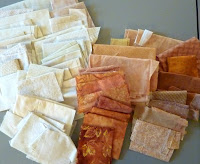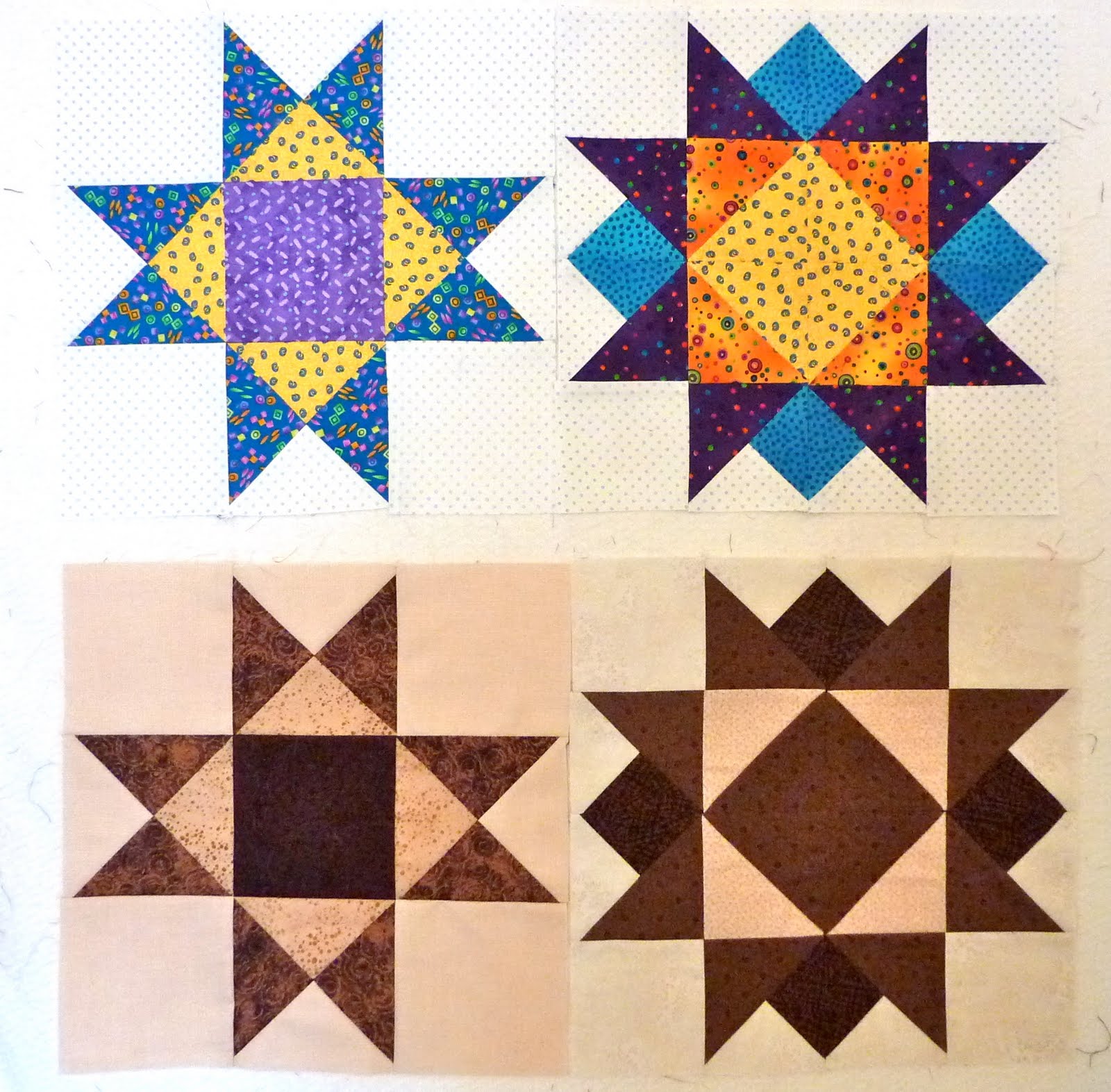 I am making one set of blocks from leftover bright scraps with a consistent white background and one set of blocks from browns and creams. This is a photo of blocks 1 to 4 in both colourways.