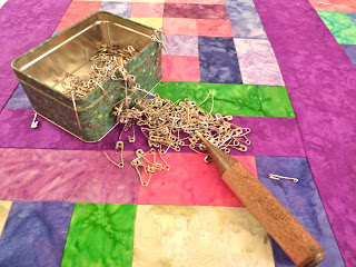 The "squares on black" border fabric was attached without drama. The whole quilt was pin basted on the weekend and the quilting was started. During the basting process I decided that the quilting was going to be primarily straight vertical lines for the main area of the quilt. It's fairly boring stitch-in-the-ditch quilting with the walking foot, but the quilt just didn't want anything fancier. And it's going very quickly so I might even make the end of week/month deadline!
