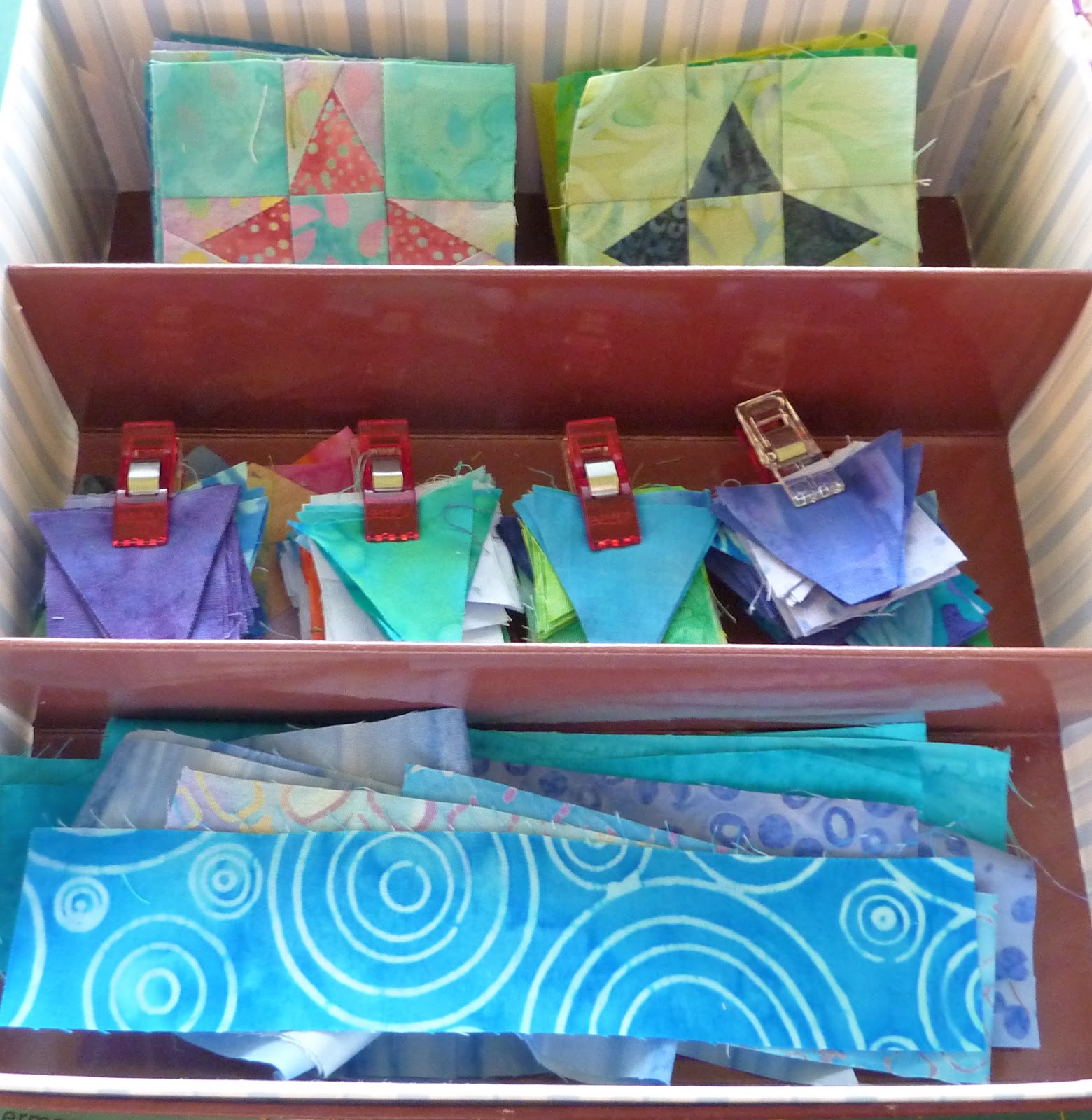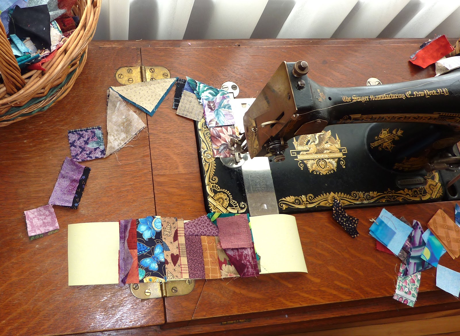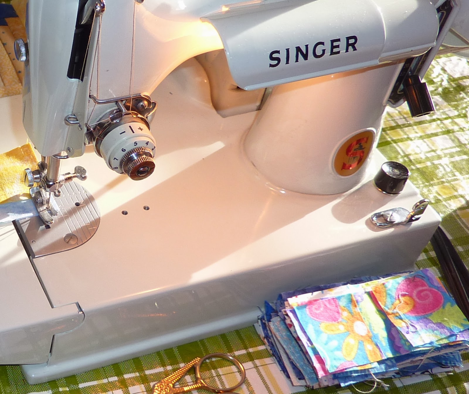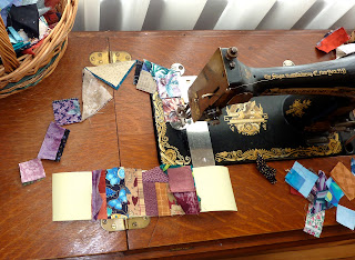 This is my machine set up, showing that I am piecing a block for the En Provence mystery quilt. And my Clarissa triangles are sitting on the right side of the machine bed waiting to be a leader/ender between sewing sections of the mystery. I love that it doesn't waste any thread! And I love that I am making progress on 2 quilts at once.