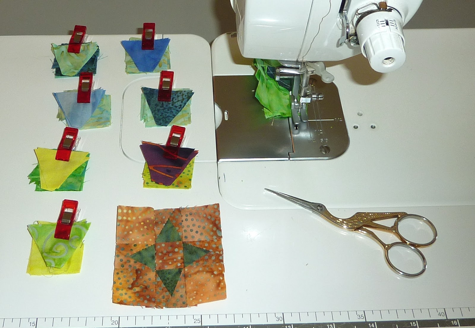 It's funny that whenever I post another Clarissa block that people think I am making HST (half square triangle) blocks. These are not HST blocks, they really are QST (quarter square triangles) which are more commonly called hourglass blocks. They are cut and sewn differently using the Companion Angle ruler, or you could use Bonnie Hunter's new ruler.